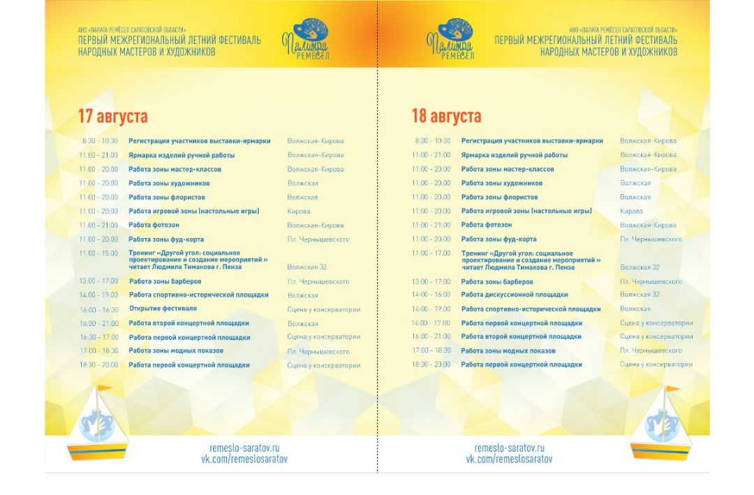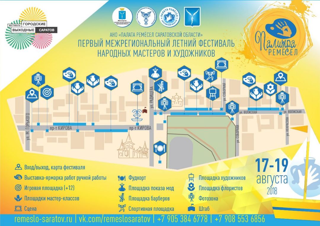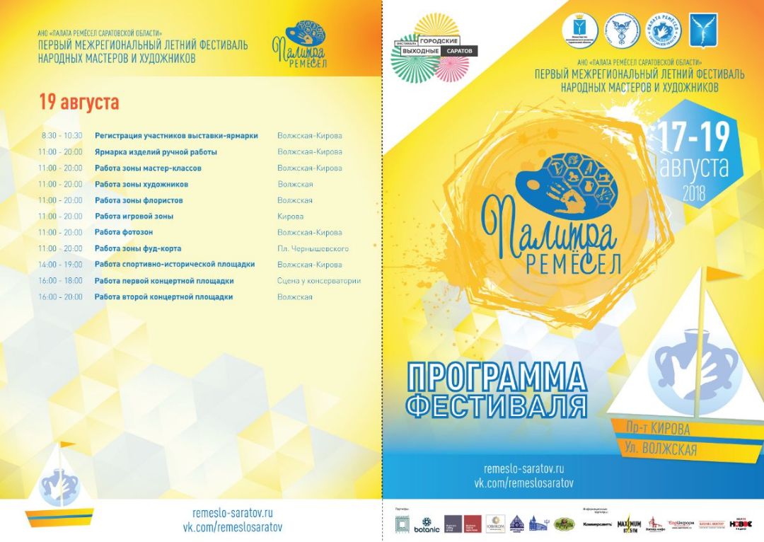 17 – 19 августа в Саратове пройдет I межрегиональный летний фестиваль народных мастеров и художников «Палитра ремесел». Организатором выступает АНО «Палата ремесел Саратовской области» при поддержке министерства экономического развития, Торгово-промышленной палаты региона и администрации Саратова.