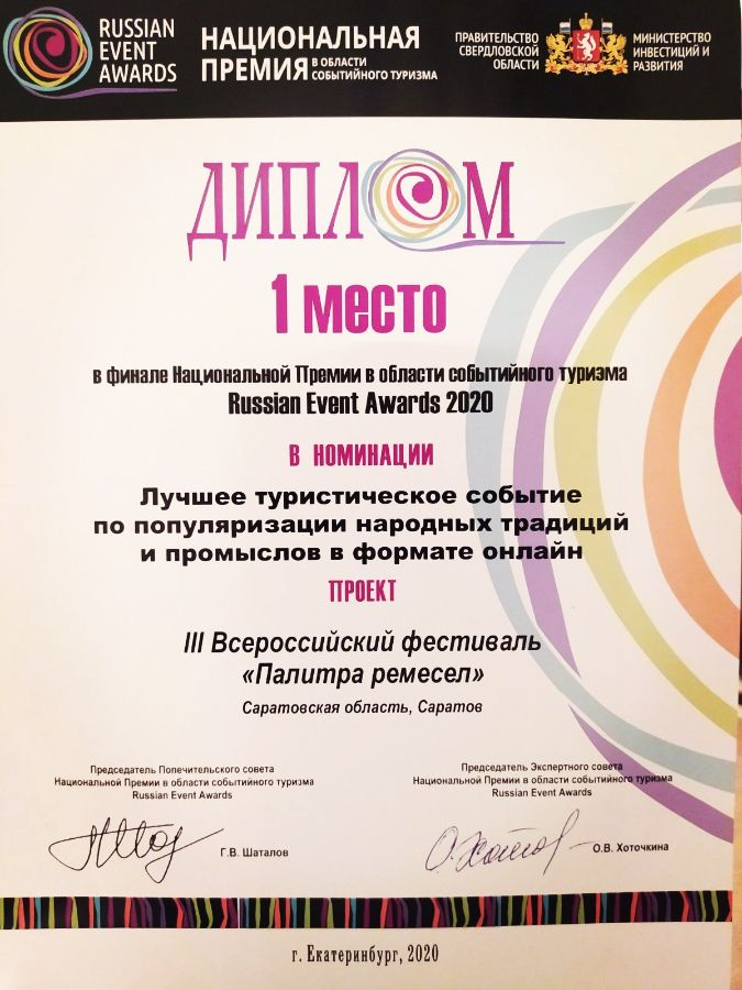 Всероссийский летний фестиваль народных мастеров и художников «Палитра ремесел», который ежегодно проводится Палатой ремесел Саратовской области, стал лауреатом Национальной премии в области событийного туризма Russian Event Awards 2020. Первое место проекту в номинации "Лучшее туристическое событие по популяризации народных традиций и промыслов в формате онлайн" присвоили 10 декабря в Екатеринбурге на церемонии награждения финалистов премии.