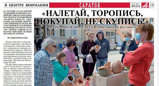 Фестиваль, организованный Палатой ремесел Саратовской области при поддержке министерства экономики и Торгово-промышленной палаты региона, вошел в ТОП 200 лучших событий года Национального событийного календаря. EventsInRussia.com - это интерактивный проект о самых интересных туристических событиях России, в котором рассказывается о фестивалях, праздниках, реконструкциях и других мероприятиях, которые стоит посетить, чтобы лучше узнать нашу большую и удивительную страну.