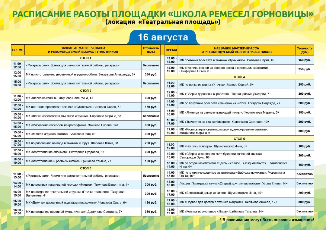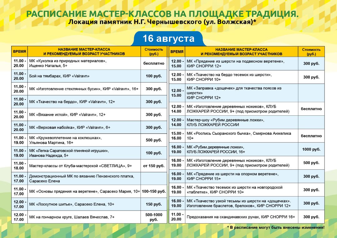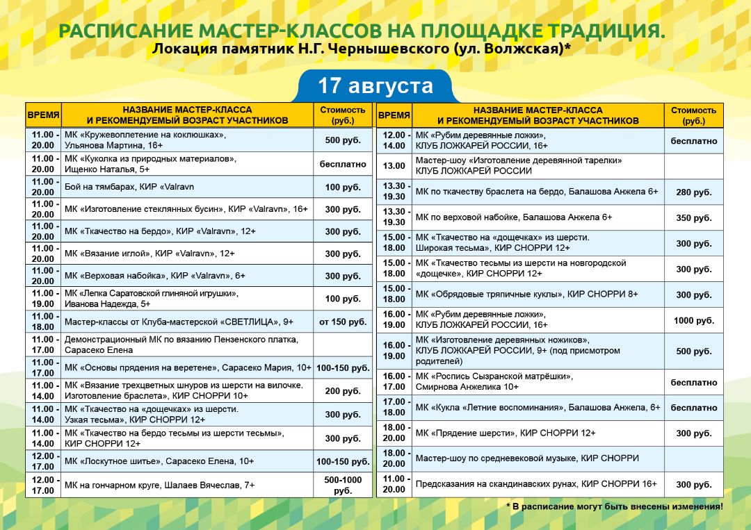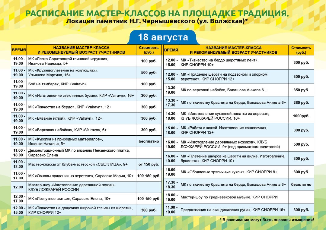 На площадке "Традиция" вы найдете мастеров, которые демонстрируют свои умения и делятся секретами мастерства. Кроме того, на площадке "Традиция" проводятся мастер-классы. Они помогут Вам научиться научиться создавать собственные изделия под руководством опытных мастеров. погрузиться в народную культуру через такие ремёсла как: ложкарное дело, кружевоплетение на коклюшках, ткачество, лаптеплетение, верховая набойка, лоскутное шитьё и многое другое.